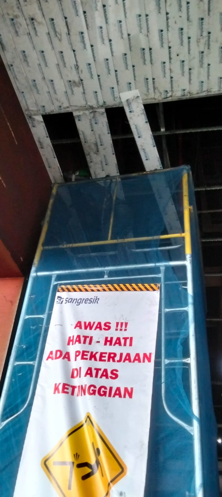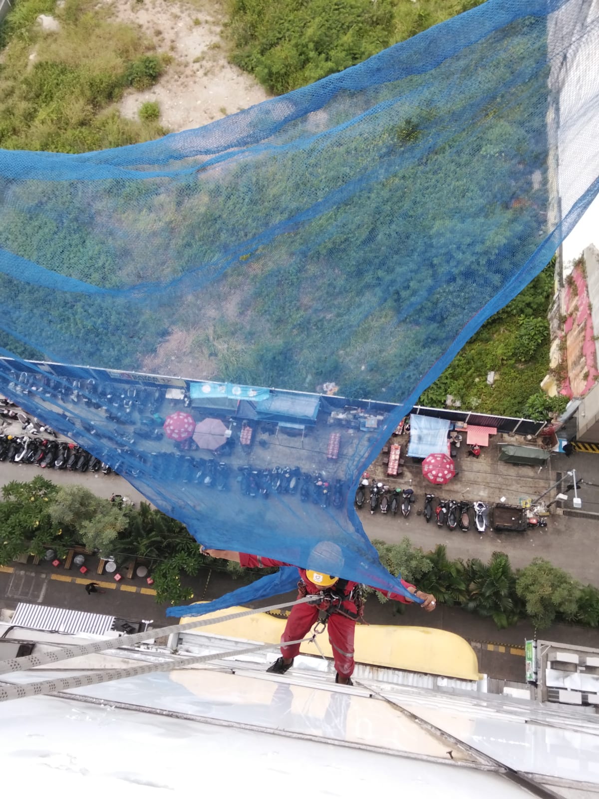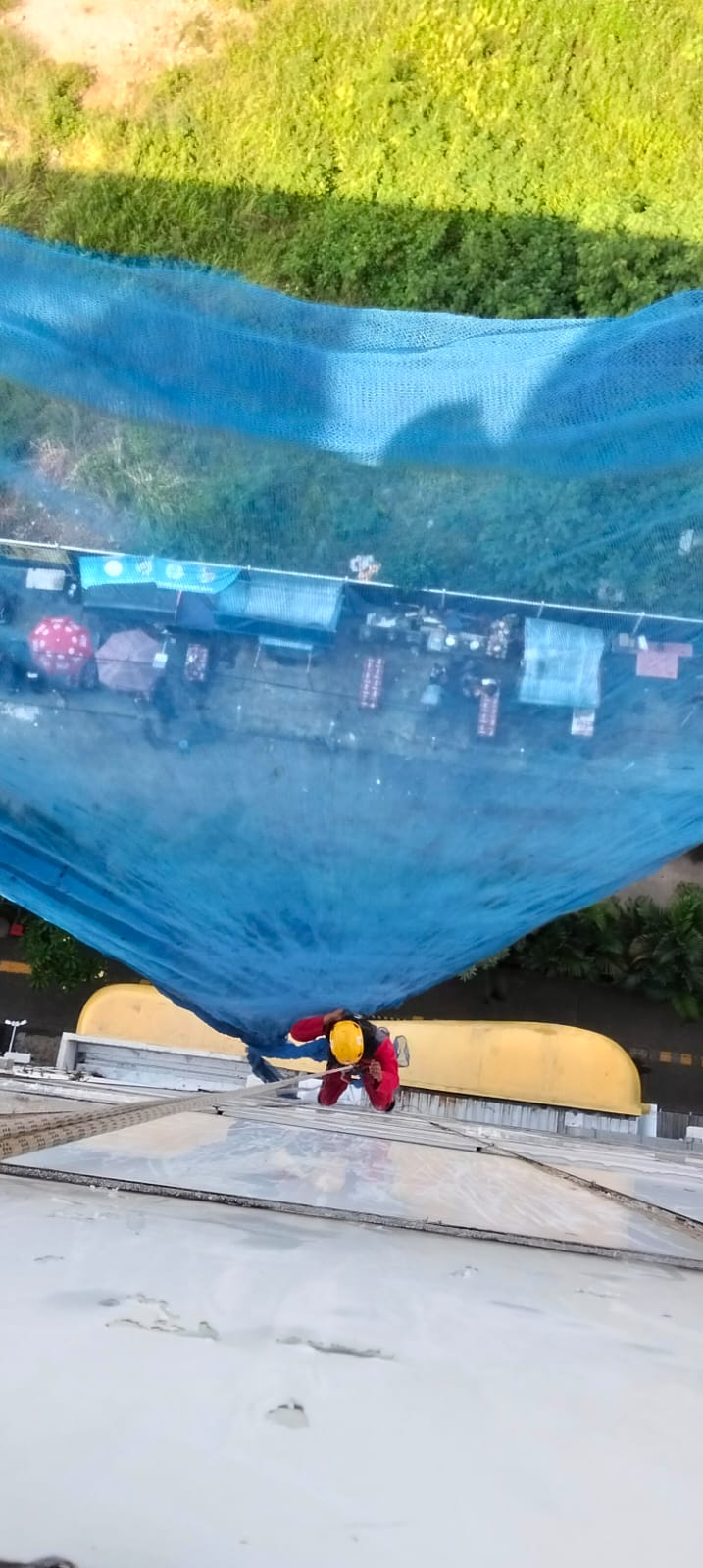 Pemasangan safetynet (jaring pengaman) berbahan polietilena/HDPE pada struktur bangunan tinggi untuk menahan jatuh orang, puing, atau peralatan. Ini adalah bagian dari prosedur K3 (Keselamatan dan Kesehatan Kerja) untuk melindungi pekerja di area tinggi serta masyarakat di sekitar proyek dari potensi kecelakaan.